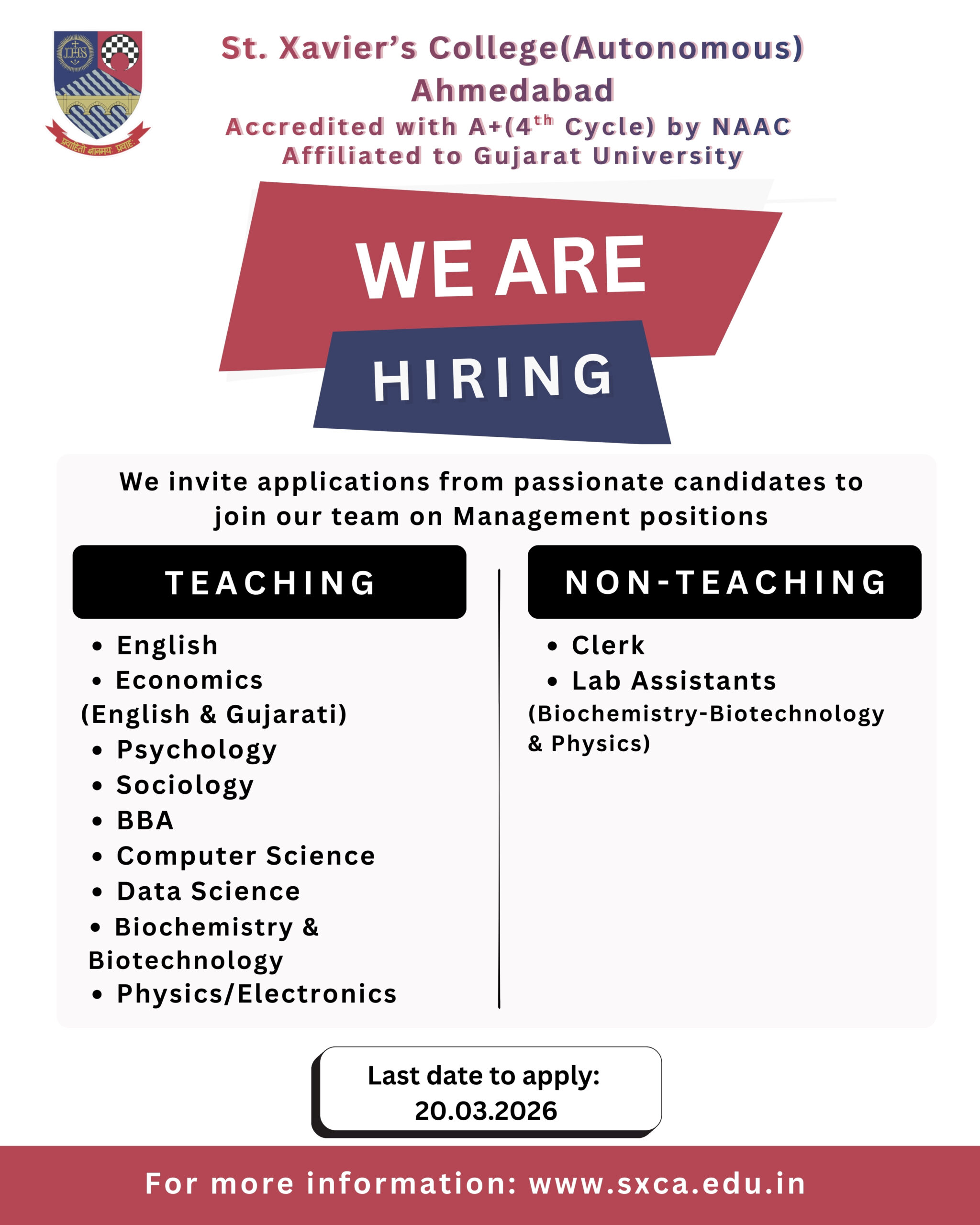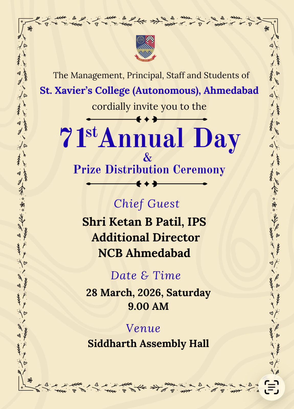 St. Xavier’s College (Autonomous), affiliated to Gujarat University is a Jesuit institute of higher education established in 1955 to mould men and women for others and to provide equal opportunity to all sections of society. College blends and focuses on academic excellence, skill development, values and ethics.